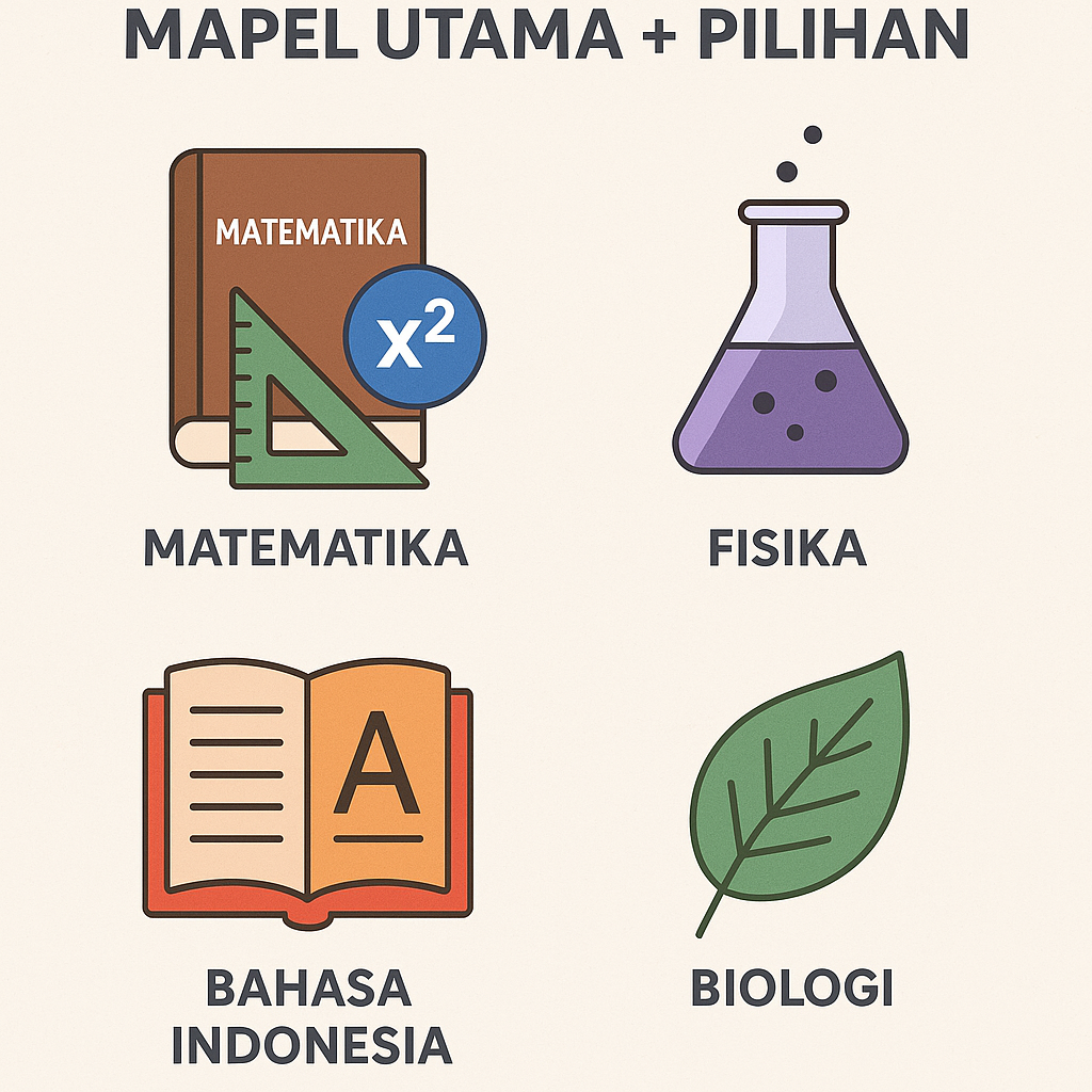 Selain tiga mapel utama, kamu bisa memilih 1 mapel tambahan sesuai jurusanmu (Fisika, Kimia, Biologi, Ekonomi, atau Sosiologi).